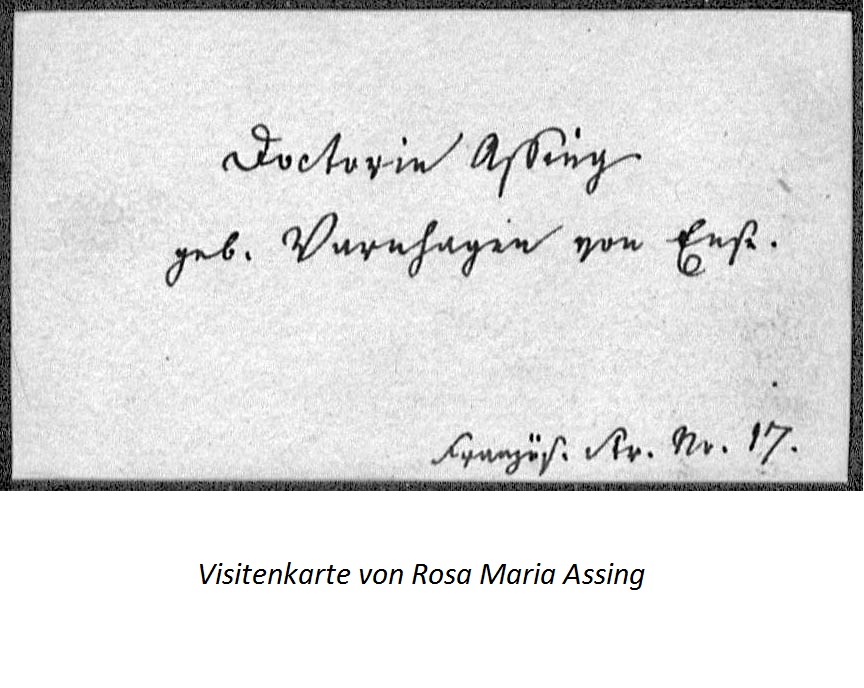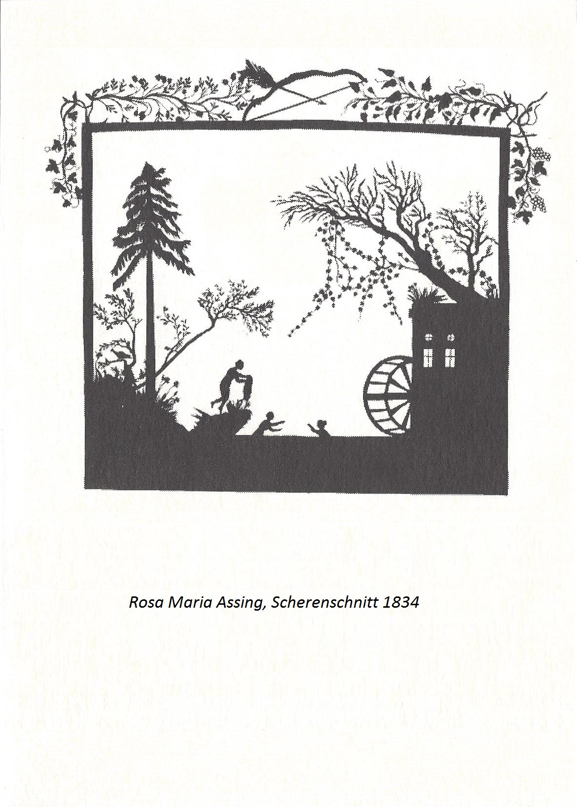 Die Schriftstellerin, Lyrikerin, Scherenschnittkünstlerin und Erzieherin Rosa Maria Assing, die 1796 dann zusammen mit ihrer Mutter und ihrem jüngeren Bruder dem aus Straßburg vertriebenen und aus Düsseldorf ausgebürgerten Vater nach Hamburg folgten, ist heute weniger bekannt für ihr literarisches Werk als vielmehr ihr Leben beispielhaft für den Beginn der bürgerlichen Emanzipation in der ersten Hälfte des 19. Jahrhunderts. Umfassende Bildung und weibliches Selbstbewusstsein führten dann nach dem frühen Tod des Vaters zur eigenständigen Gründung eines Mädchenpensionats in Altona, das sie 1814 erfolgreich in die Neustadt verlegte. 1814 heiratete sie dann auch den aus den Freiheitskriegen kommenden, mit dem Eisernen Kreuz geehrten Arzt David Assur Assing. In dem bescheidenen Haus in der Neustadt (Poolstraße), in dem die Familie mit den beiden Töchtern Ludmilla und Ottilie lebte, führte sie, sicherlich auch angeregt durch ihre Berliner Schwägerin Rahel und ihren mittlerweile sehr berühmten Bruder Karl August Varnhagen, einen literarischen Salon. Schriftsteller und aufgeklärte Intellektuelle verkehrten hier wie Heinrich Heine, Friedrich Hebbel, Karl Gutzkow, Ludolf Wienbarg oder Gabriel Riesser. In dieser aufgeklärten und künstlerisch höchst produktiven Sphäre war sie sehr rege auch selbst literarisch tätig und verfertigte mit höchster Kunstfertigkeit Scherenschnitte.